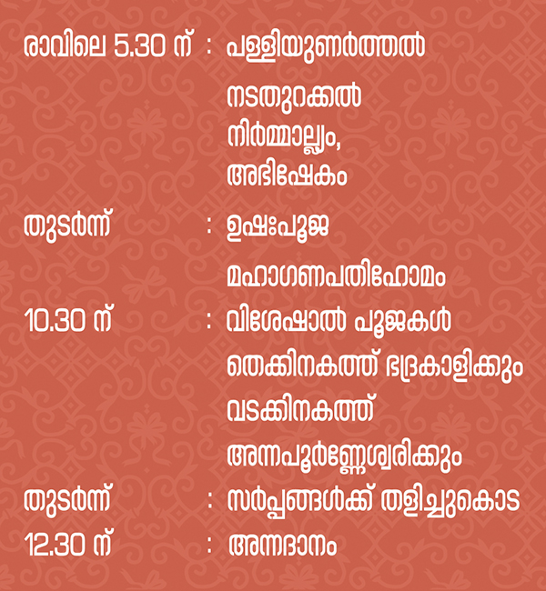 ഭഗവതി സേവയും വലിയഗുരുതിയും സർപ്പങ്ങൾക്കു തളിച്ചുകുടയും യക്ഷി ഗന്ധർവന്മാർക്ക് വിശേഷാൽ പൂജയും രക്ഷസ്സിനു പാൽപ്പായസവും അറുകുലകൾക്ക് ദാഹം വയ്പ്പും സമർപ്പിക്കാൻ കഴിയുന്നതാണ്.